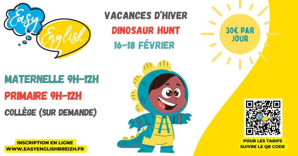 Les inscriptions sont ouvertes dès maintenant pour notre prochain Stage d‘hiver (Dinosaur Hunt). Pour réserver, remplissez notre formulaire en ligne ici et nous vous contacterons pour confirmer la place de votre enfant. Consultez notre planning pour connaître les horaires et les tarifs.